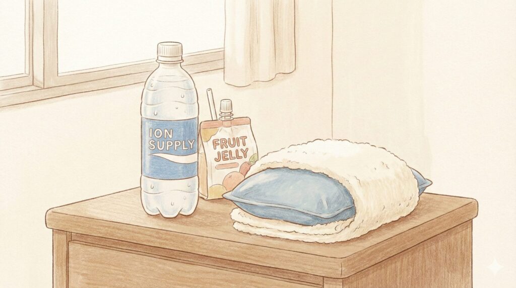 ・水分補給:熱や下痢で水分が失われやすいため、母乳やミルク、湯冷まし、麦茶、赤ちゃん用のイオン飲料や経口補水液(OS-1など)を、少量ずつこまめに与えましょう。