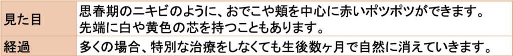 生後2週間から1ヶ月頃の赤ちゃんに多く見られます。お母さんのお腹の中にいた時にもらったホルモンの影響で、一時的に皮脂の分泌が活発になることで起こります。