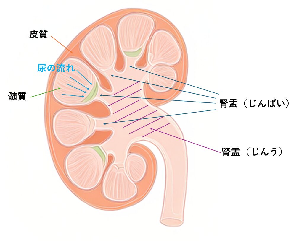 尿は腎臓で作られます。以下の図のように、腎皮質→腎髄質→腎杯→腎盂→尿管→膀胱→尿道 と順番に流れていきます。しかし、途中の尿の通り道が狭かったり、逆流したりすることで、腎臓の中にある「腎盂(じんう)」や「腎杯(じんぱい)」という部分が、水風船のように膨らんでしまうことを「水腎症」といいます。