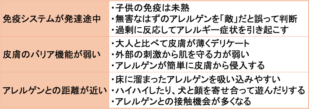 子供の未熟な身体と、犬と密接に関わる生活スタイルが、同じ環境でも大人よりアレルギー症状を引き起こしやすくなります。