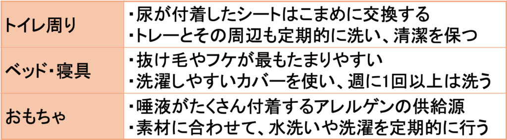 ③トイレ・ベッド・おもちゃを小まめに清潔にする