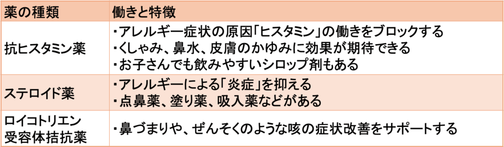 薬物療法は、アレルギー反応によって引き起こされる、くしゃみや鼻水、目のかゆみといった症状を抑える基本的な治療法です。原因そのものを治すわけではなく、症状を和らげることで、お子さんが穏やかに過ごせる時間を増やします。