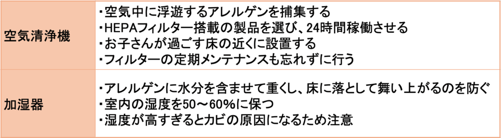 日々の掃除や換気に加え、空気清浄機や加湿器といった家電を活用すると、室内のアレルゲンを減らせます。