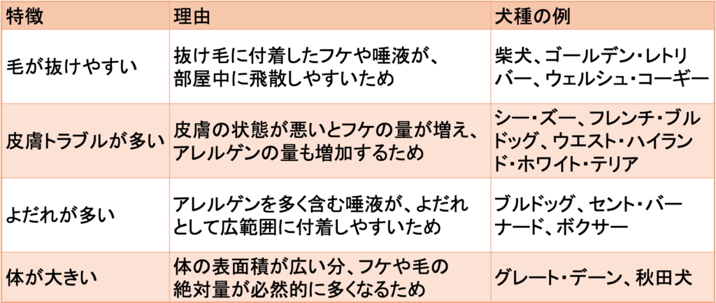 一般的に、次のような特徴を持つ犬種は、アレルゲンが広がりやすいため注意が必要とされています。