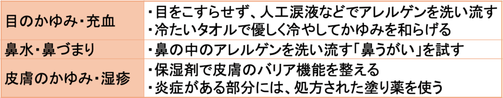 出ている症状を和らげるためには、環境整備(アレルゲンの回避)も重要です。薬による治療と並行して、ケアを行うことで、お子さんの不快感を和らげ、穏やかに過ごすことができます。