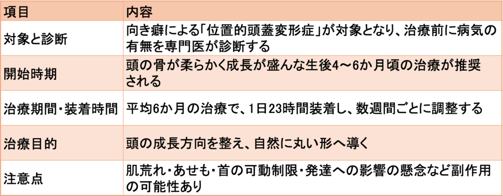 基本的には、向き癖の修正や寝かせ方の工夫など自宅でのケアが第一選択となります。それでも改善が難しい場合にヘルメット治療(自由診療)が検討されます。