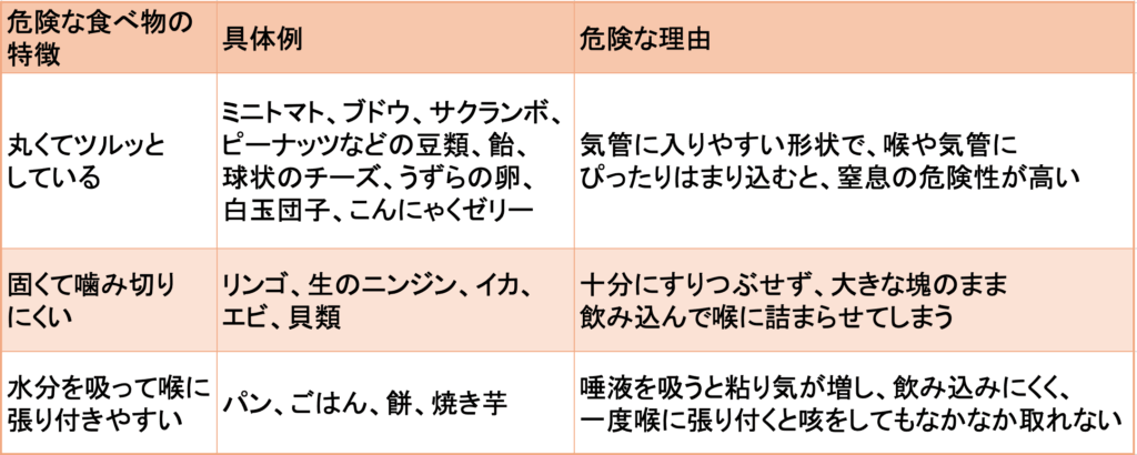 子どもが誤嚥しないよう特に注意が必要な食べ物には、以下のような特徴があります。