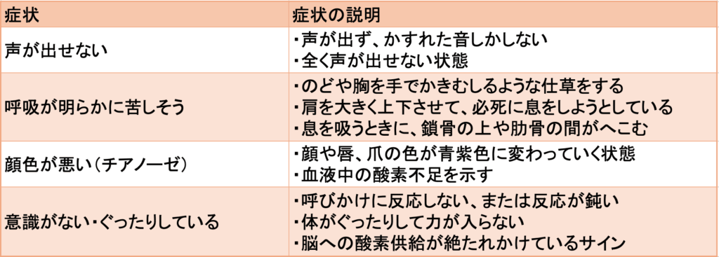 お子さんが誤嚥を起こしたときに見られる危険な症状を以下の表にまとめました。(※1)