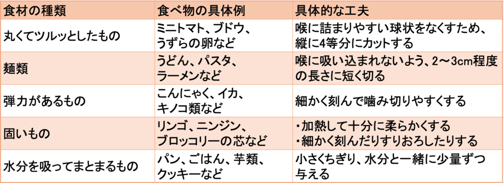 子どもの誤嚥を防ぐ予防法の一つが、食材の切り方を工夫することです。食材別の工夫ポイントを以下の表にまとめました。