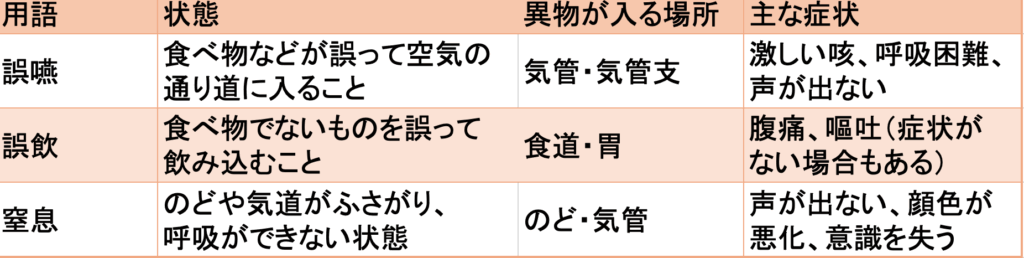 似ている状態として、誤飲や窒息などがありますが、それぞれの違いは次のとおりです。