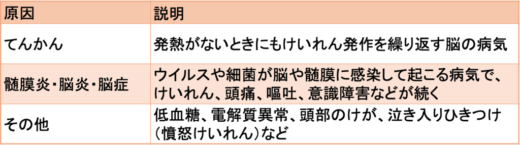 熱性けいれん以外のけいれんの原因は、以下のとおりです。