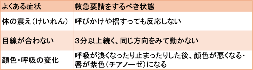 けいれん時に見られる主な症状を以下にまとめました。