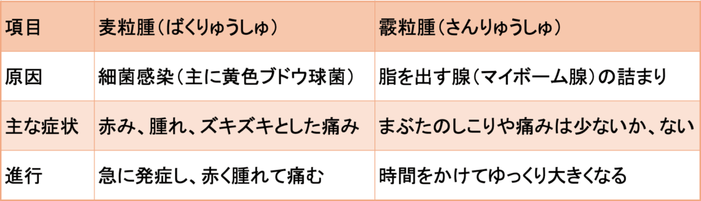 ものもらいの種類と特徴を表にまとめています。