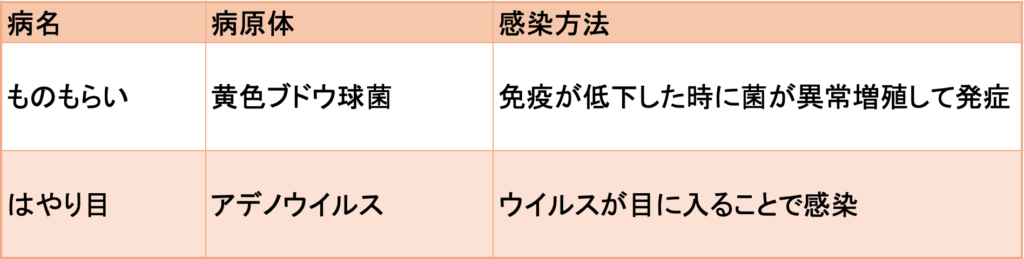 ものもらいとはやり目の原因や感染方法は以下のとおりです。