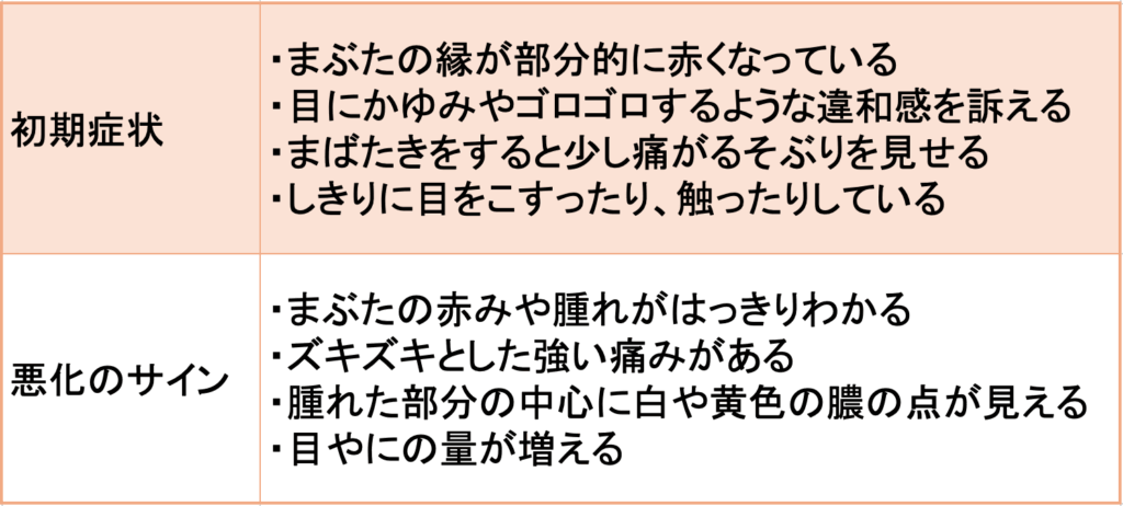 初期は赤み・軽い違和感のみですが、悪化すると膿点が見えたり、痛みで開けづらくなったりします。