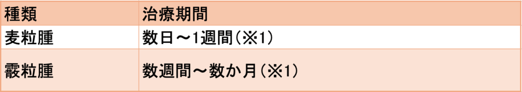 A.ものもらいが治るまでの期間はその種類や症状の重さ、治療を始めたタイミングによって大きく異なります。