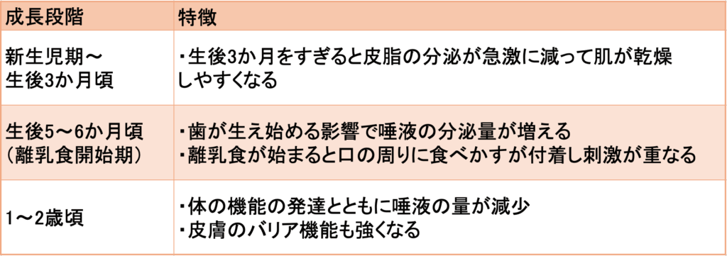 よだれかぶれが起こりやすい時期は、離乳食を食べ始める生後5~6か月頃です。以下のように成長段階に応じて、かぶれやすさが異なります。