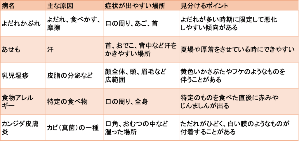 よだれかぶれに似ている病気の原因や特徴を表にまとめました。