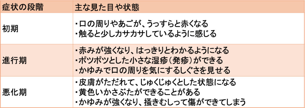 口周りの皮膚が赤くなり乾燥してかゆみを伴うのが特徴で、湿疹やブツブツができることもあります。