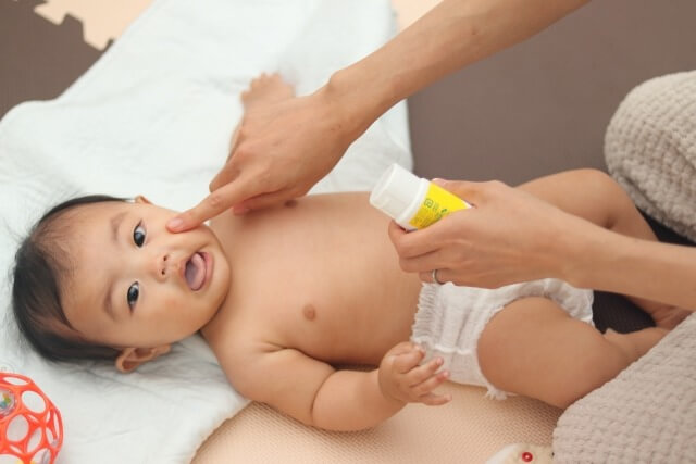 スキンケアは赤ちゃんの肌に合う、無香料・無着色・低刺激性の製品が基本です。保湿剤を十分な量を手に取り、優しく肌に乗せるように広げましょう。