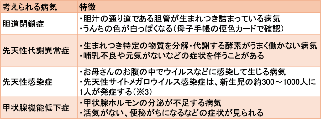 お母さんと赤ちゃんの血液型の「組み合わせ」によっては、赤血球が壊れやすくなり、黄疸が強くなる「血液型不適合黄疸」やウイルス・細菌による感染症が代表例です。生まれつき胆汁の通り道(胆道)がふさがっている胆道閉鎖症も原因として挙げられます。