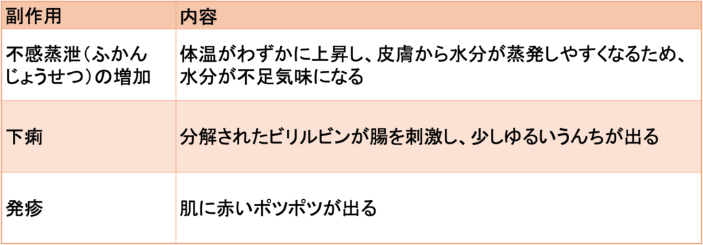 ただし、光線療法は、まれに以下のような副作用が一時的に見られる点に注意してください。
