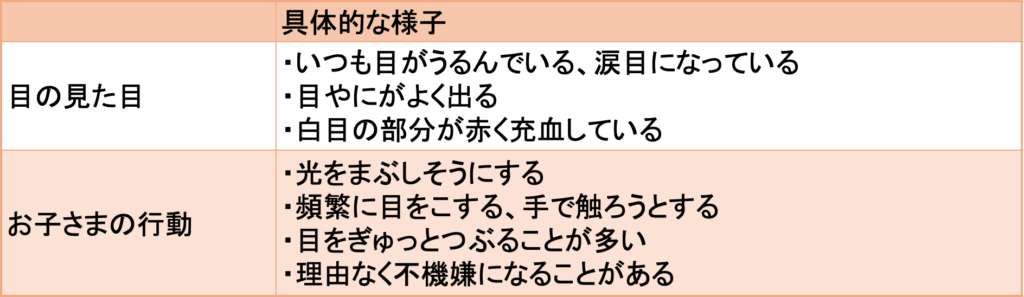 - 赤ちゃん自身が、痛みや不快感から常に目をこすったり、光を極端にまぶしがったりする