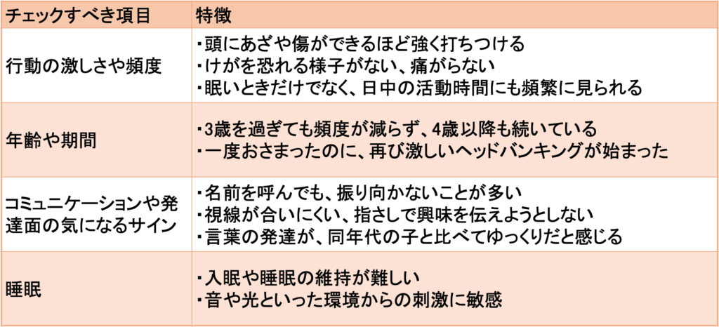 ヘッドバンキングは、自分の行動に集中することで心地良い状態を保とうとする、一種の自己調整機能です。発達の過程でごく自然に見られる行動であり、多くは成長とともに落ち着いていきます。