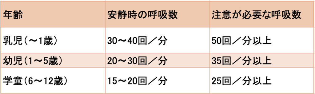 子どもの安静時に、以下の表を参考に呼吸を数えてみましょう。(※1)*改変