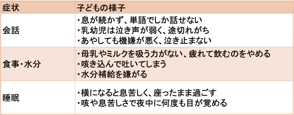 陥没呼吸や呼吸数の増加など、呼吸症状が重い場合も入院の目安となります。
