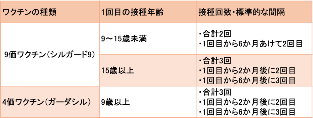 HPVワクチンで予防効果を得るためには、決められた回数を適切な間隔で接種し終えることが重要です。接種スケジュールは、使用するワクチンの種類と、1回目の接種を開始する年齢によって異なります。現在、公費接種では主に9価ワクチン(シルガード9)が使用されています。