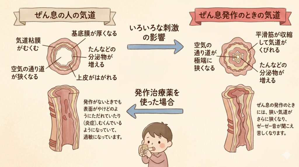 刺激にともない、気道が狭くなると、ゼーゼーとした音が聞こえ、苦しくなります。